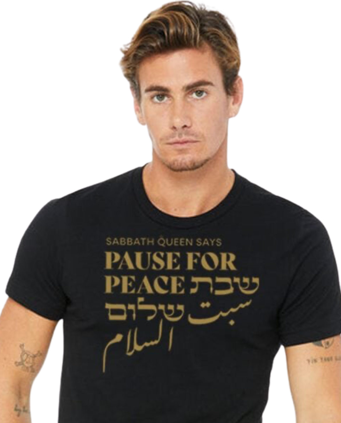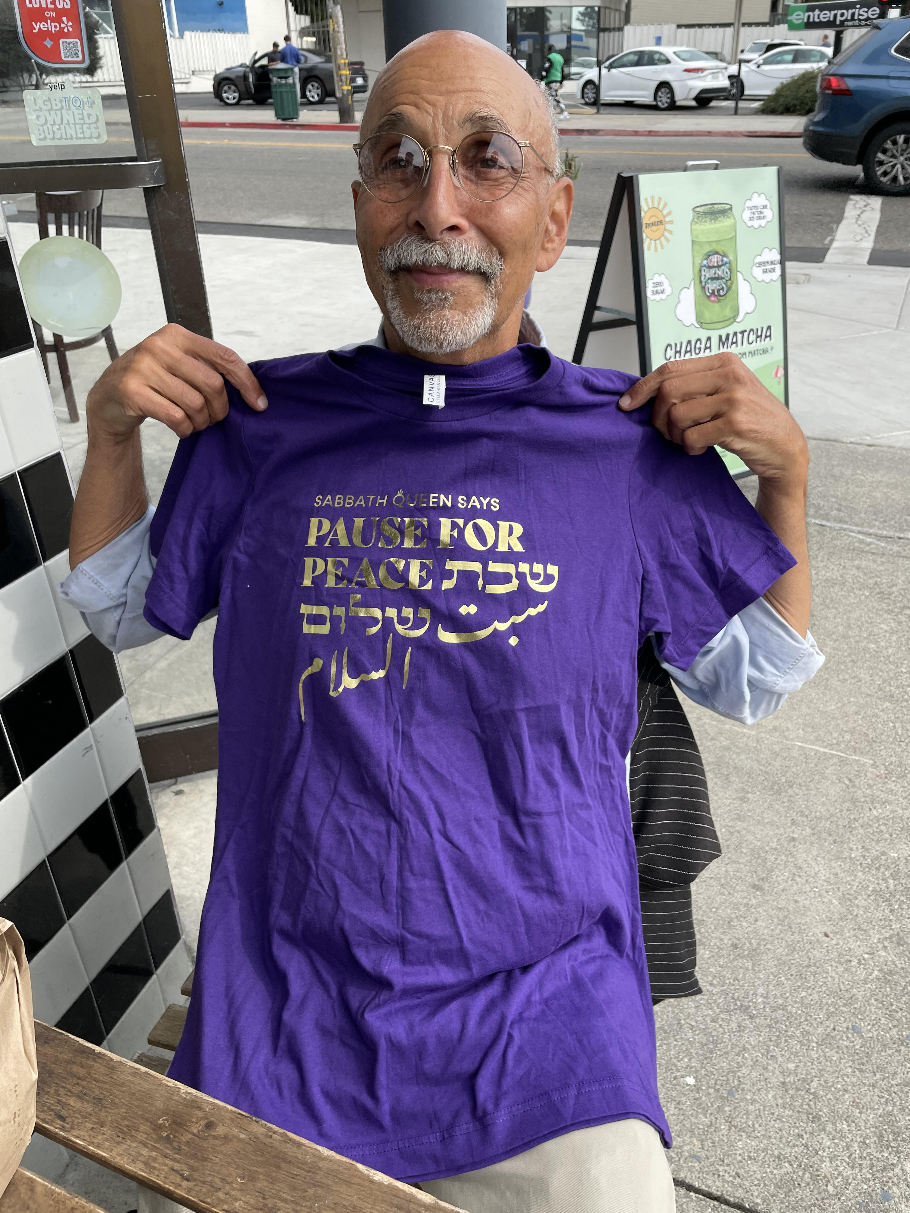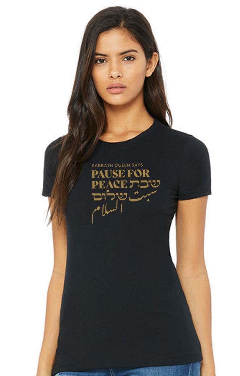 Created in response to the ongoing conflicts and most recent violence in the Middle East and all over the world, the ‘Pause for Peace’ collection features wearable prayers and protests for peace among all people, with elegant metallic gold lettering in English, Hebrew, and Arabic, designed by Amichai for the world premiere of the Sabbath Queen film in June 2024.
